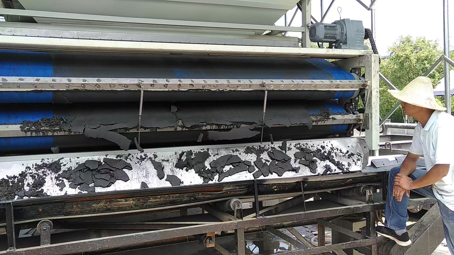 The photos below show a Haibar dewatering unit supplied to Brazil in 2022 for a river dredging and algae removal project. The equipment was used on site to treat mixed materials consisting of algae and dredged sediment with high moisture content and organic load. During operation, the system demonstrated stable continuous performance, smooth dewatering and well-formed sludge cake, meeting on-site transportation and downstream disposal requirements and supporting effective emergency waterway management.
